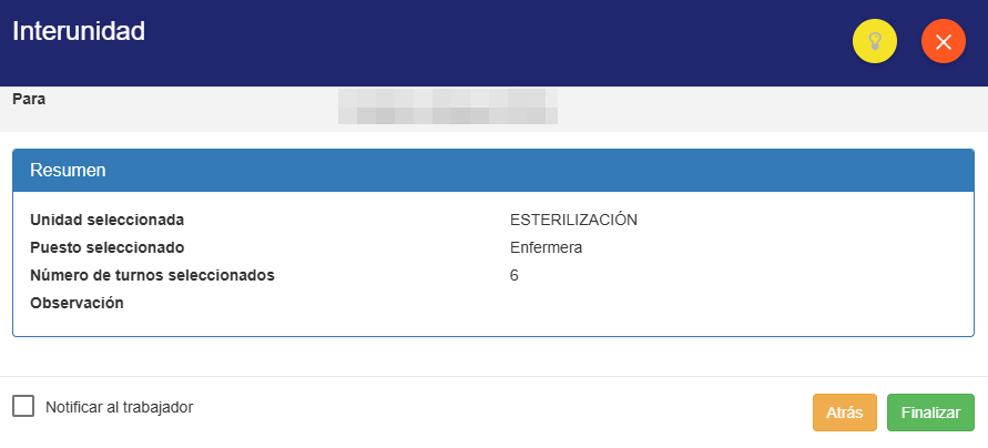 6️⃣ Revisa el detalle de la unidad de destino y los turnos seleccionados, luego haz clic en Finalizar.