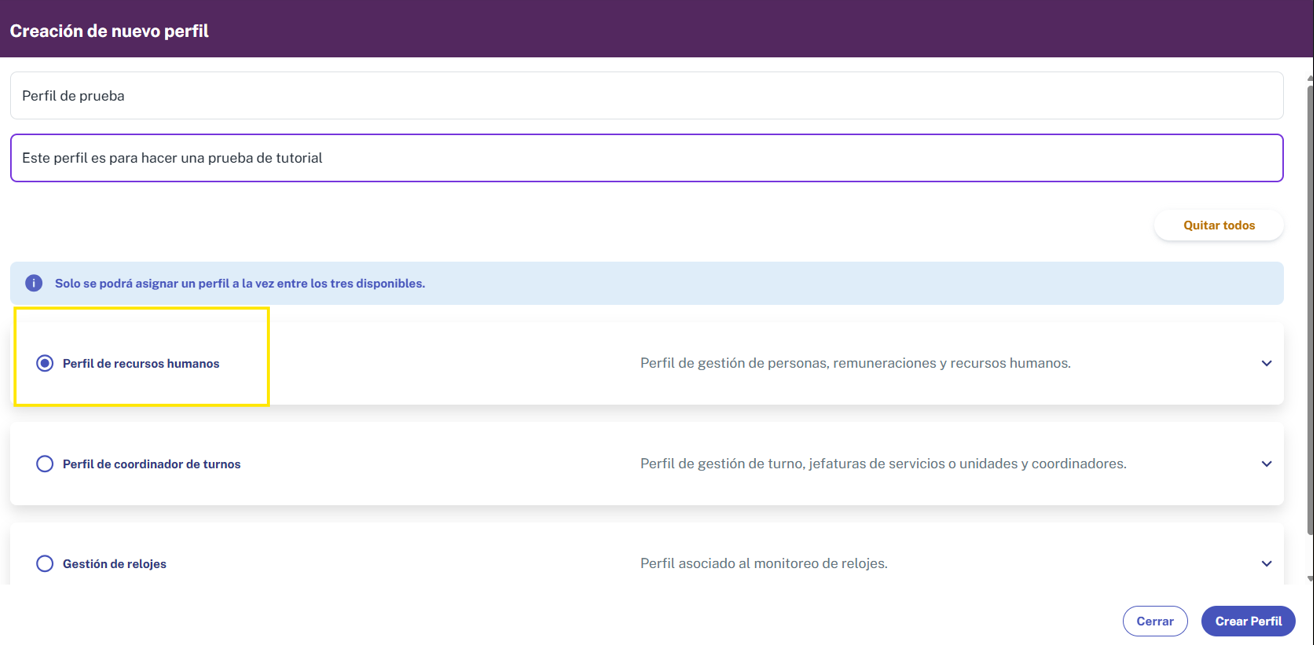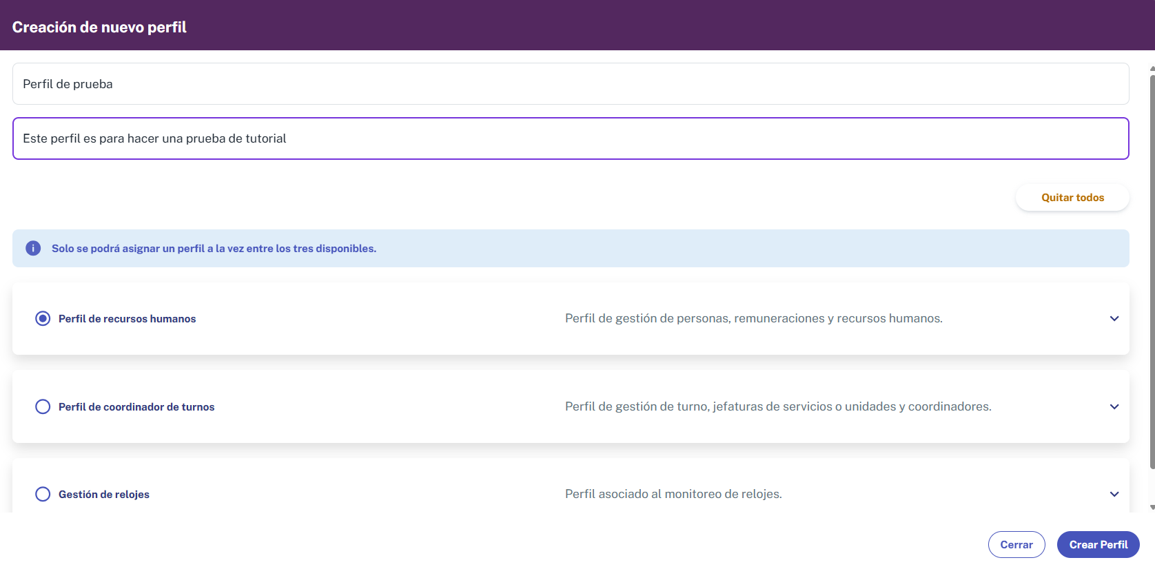 Más abajo, en el campo de descripción, te recomendamos detallar el propósito o rol de ese perfil (por ejemplo: “Jefatura de Urgencias con acceso a turnos y permisos”).