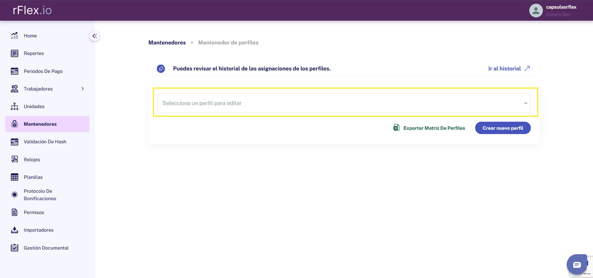 Desde el menú lateral, accede al Mantenedor de Perfiles y haz clic en el botón “Selecciona un perfil para editar”.