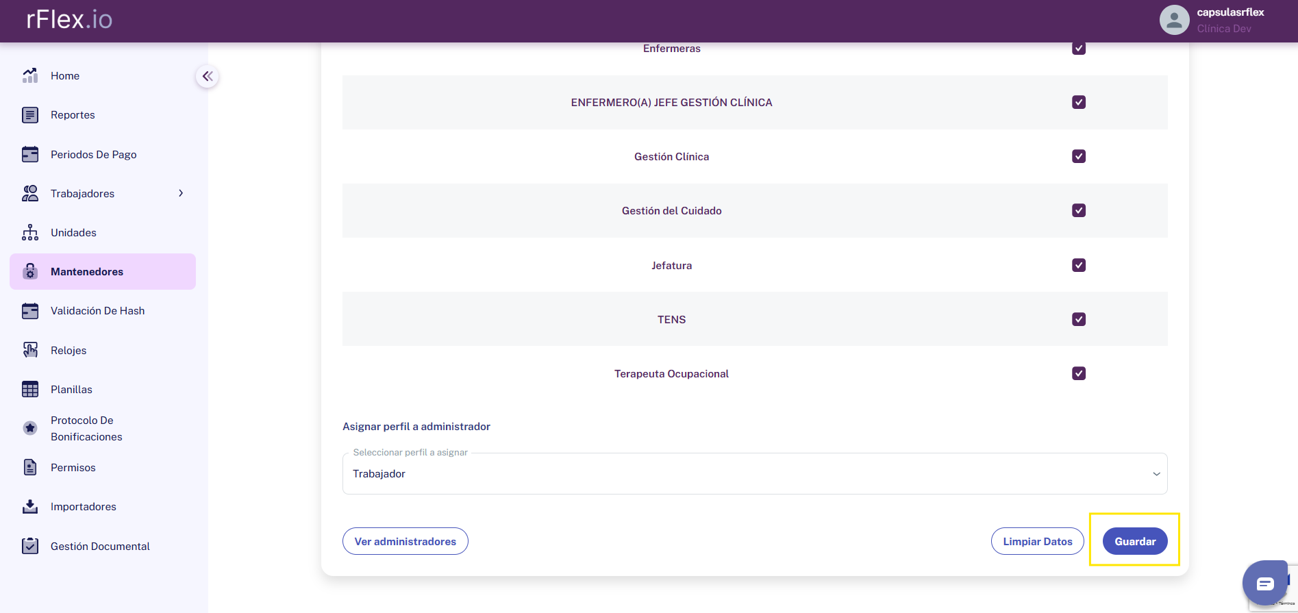 Una vez que tienes creados tus perfiles, puedes asignarlos a las personas que administran funciones dentro del sistema. Esto se hace desde el Mantenedor de Administradores, y es clave para que cada usuario tenga acceso únicamente a lo que necesita.