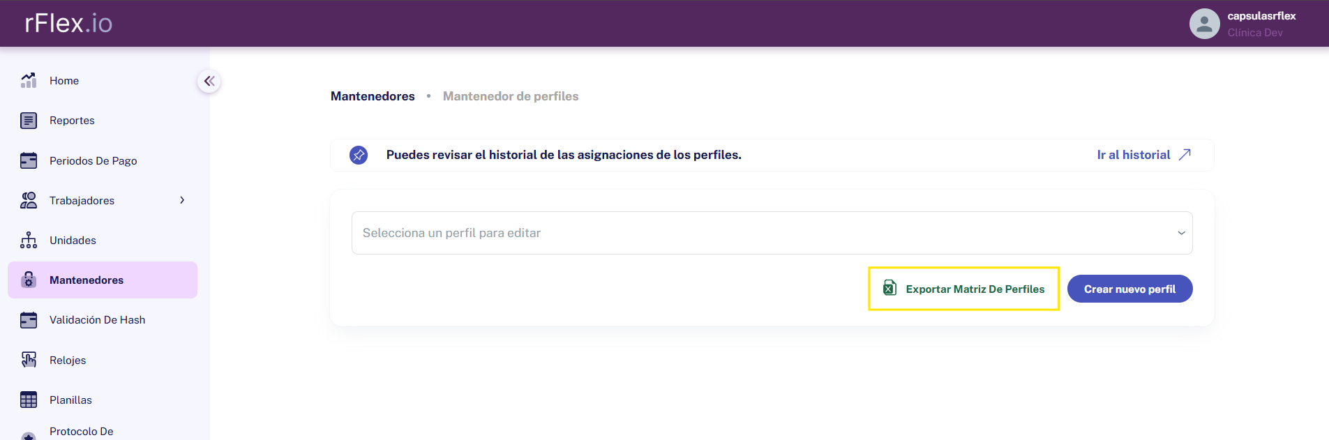 Ingresa al Mantenedor de Perfiles. Haz clic en el botón “Exportar matriz de perfiles”.
