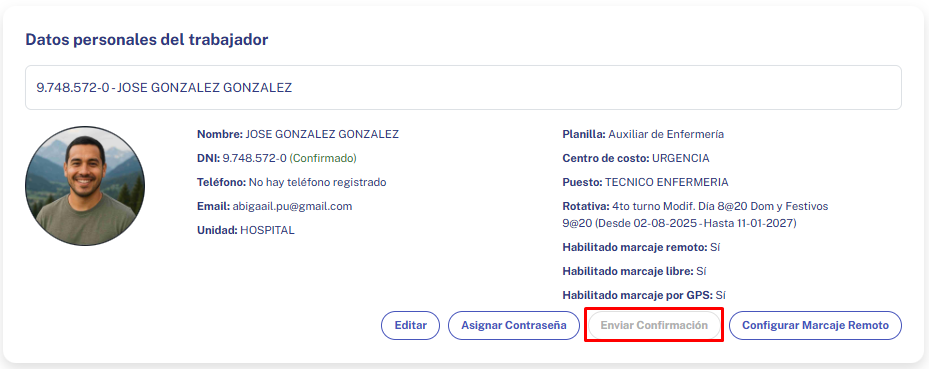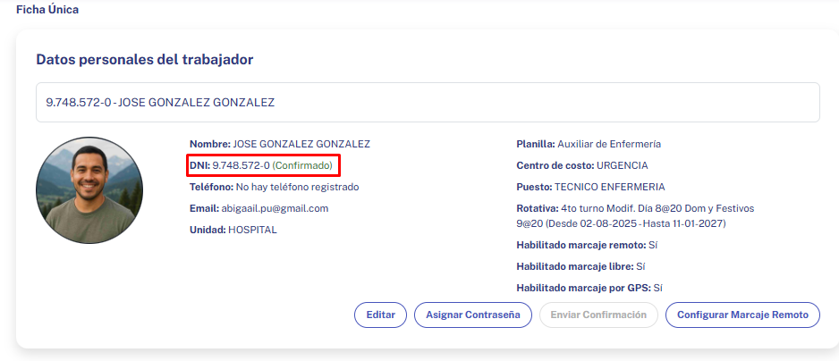 Una vez dentro de su ficha, revisa el sector de DNI para confirmar si su cuenta ya está activa.